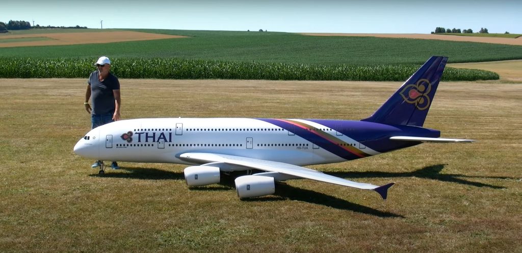 Now, the turbine aircraft you’ll see in the video below is a 1/13 scale replica of the Thai Airways A-380. It has a wingspan of 6.13 meters and a length of 5.6 meters. That means the weight is down to 226 lbs (102 kg). To an untrained eye, it seems impossible to tell whether this is real or not.